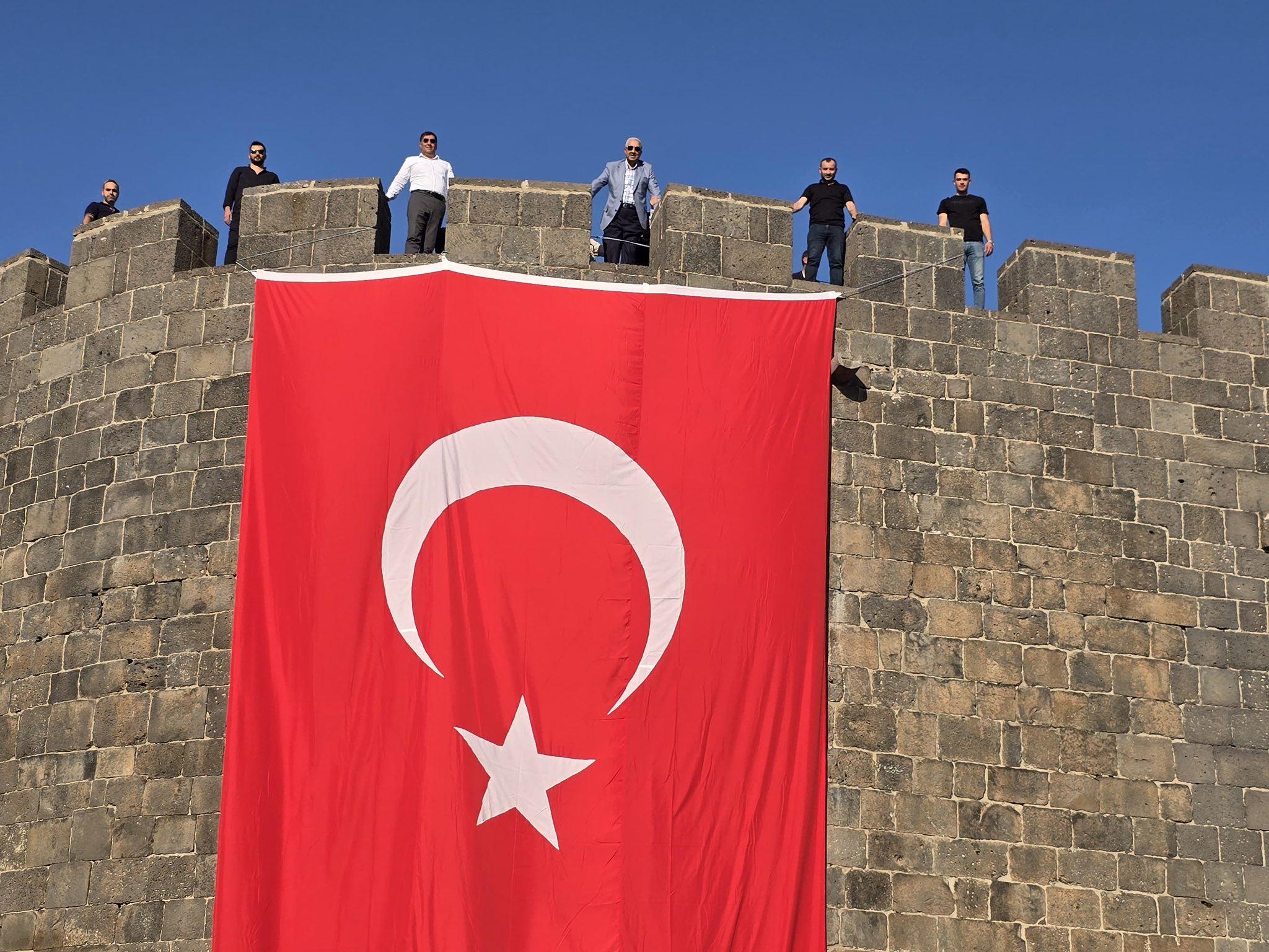 AK Parti Diyarbakır İl Başkanı Ömer İler ve yönetim kurulu üyeleri tarafından, Sur İlçe Başkanı Davut Yıldız ile birlikte Sur ilçesindeki tarihi surların üzerine Türk bayrakları asıldı.