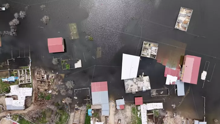 Baraj kapaklarının açılmasıyla gelen su, ilçeye 15 kilometre uzaklıktaki 45 hane ve 161 nüfuslu kırsal Şerifoğulları Mahallesi’ne ulaştı. Daha önce boşaltılan 10 ev su altında kaldı. Su altındaki evler, dronla görüntülendi.